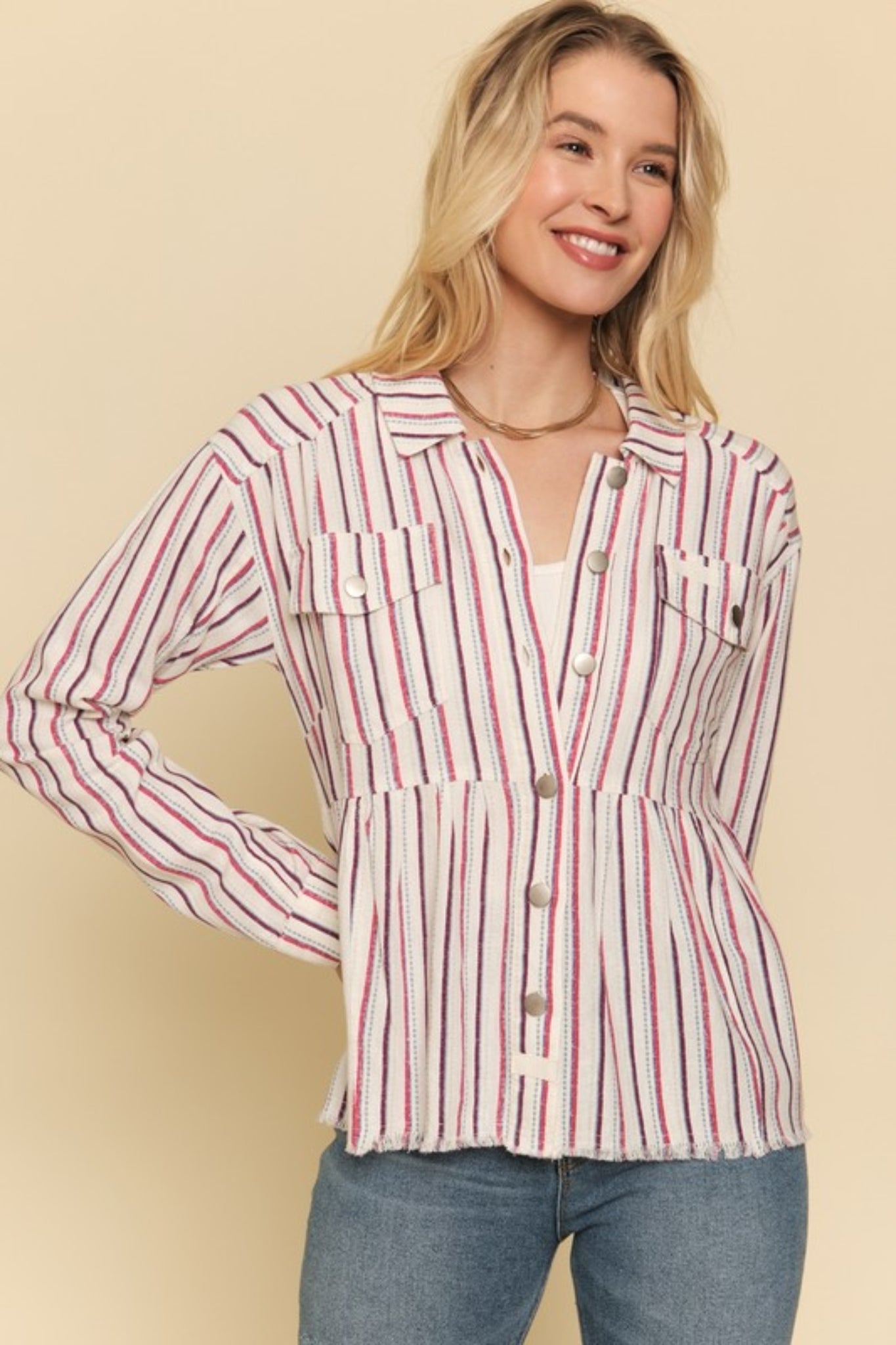Elevate your wardrobe with our Lennon Striped Peplum Top! This top features a trendy button down front and a unique rough cut hemline that adds a touch of edge to any outfit. Show off your fashion-forward style in this must-have piece!