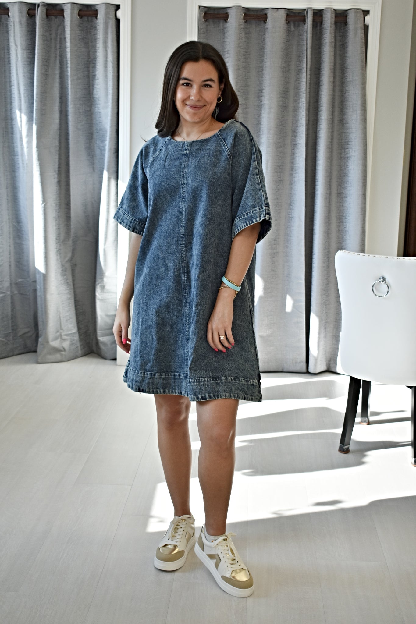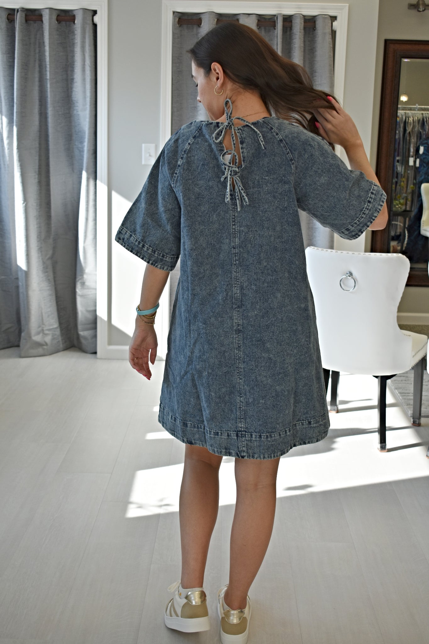 The Alora Denim Dress combines effortless style with practical design. This short-sleeve denim piece features a flattering tie-back detail at the neckline and a graceful swing hem that moves with you. Functional side pockets keep your essentials close, while coordinating bands at the hem and sleeves add a polished finishing touch. Perfect for casual outings or dressed-up occasions, this versatile dress transitions seamlessly from day to night.