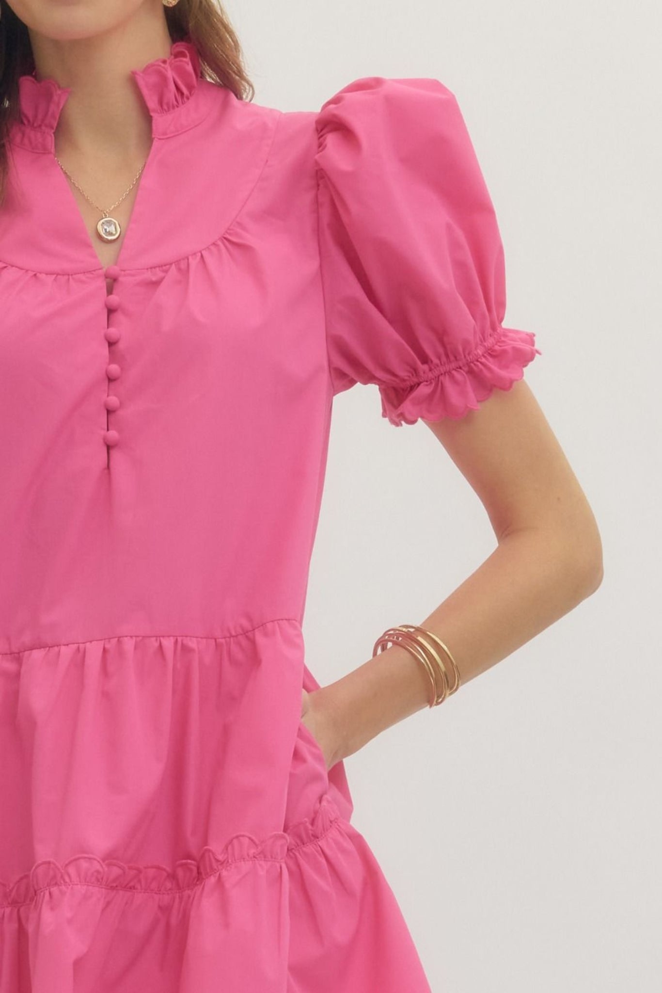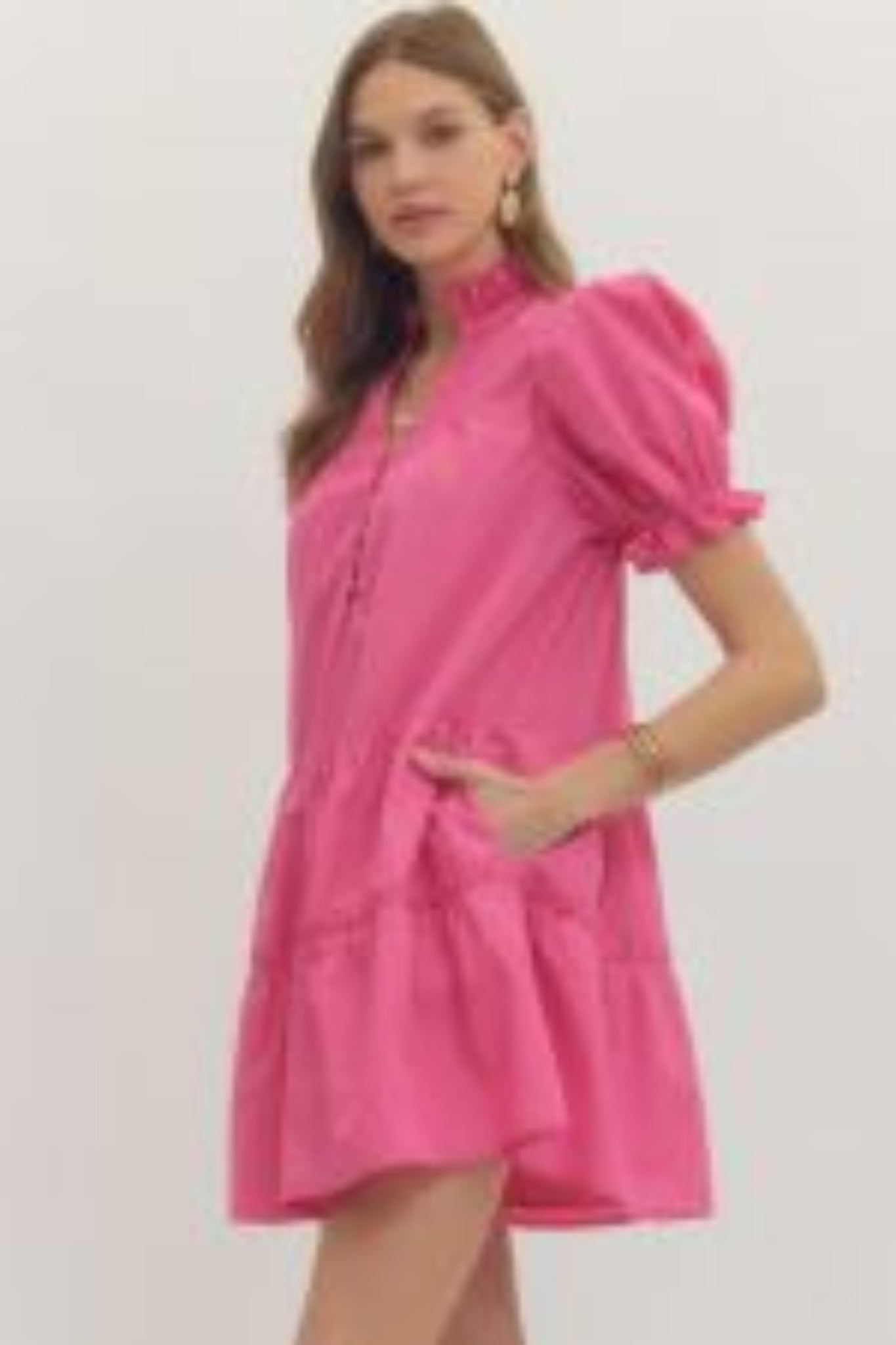 The Lucia Solid Mini Dress combines effortless elegance with playful details. This lightweight woven piece features a charming mock neck and statement puff sleeves that frame the shoulders beautifully. The front button closure allows for easy styling versatility, while tiered ruffles at the hem add movement and dimension. Fully lined for comfort and confidence, this non-sheer dress transitions seamlessly from day to night. Perfect for anyone seeking a polished yet fun silhouette that feels as good as it looks.