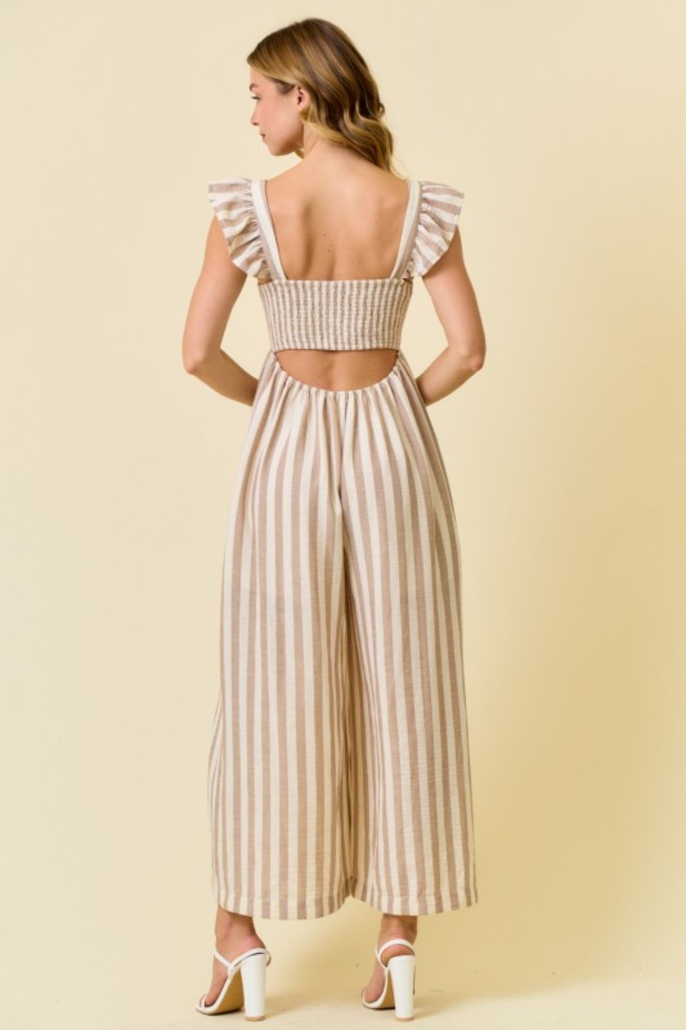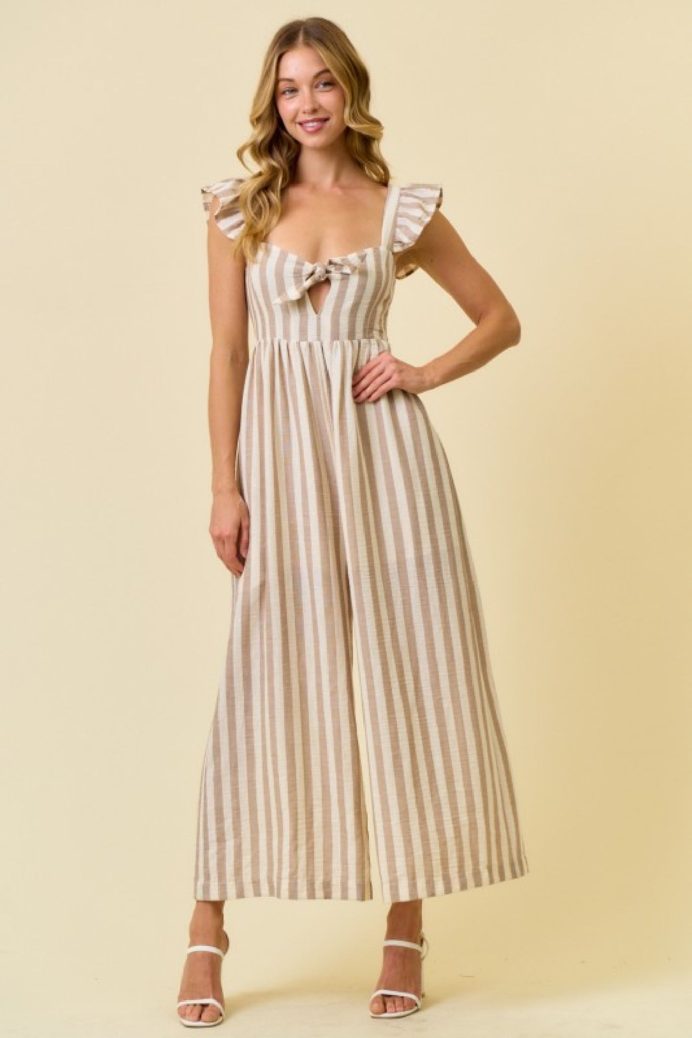 Effortlessly chic and undeniably comfortable, the Burgh Wide Leg Jumpsuit combines timeless elegance with modern flair. Crafted from breathable striped cotton gauze, this one-piece wonder features a flattering sweetheart neckline and charming front tie detail that cinches your silhouette. Delicate ruffle shoulder straps and a subtle keyhole cutout add just the right touch of sophistication. Perfect for brunch dates, casual outings, or elevated weekend wear—this jumpsuit transitions seamlessly from day to night while keeping you cool and confident.