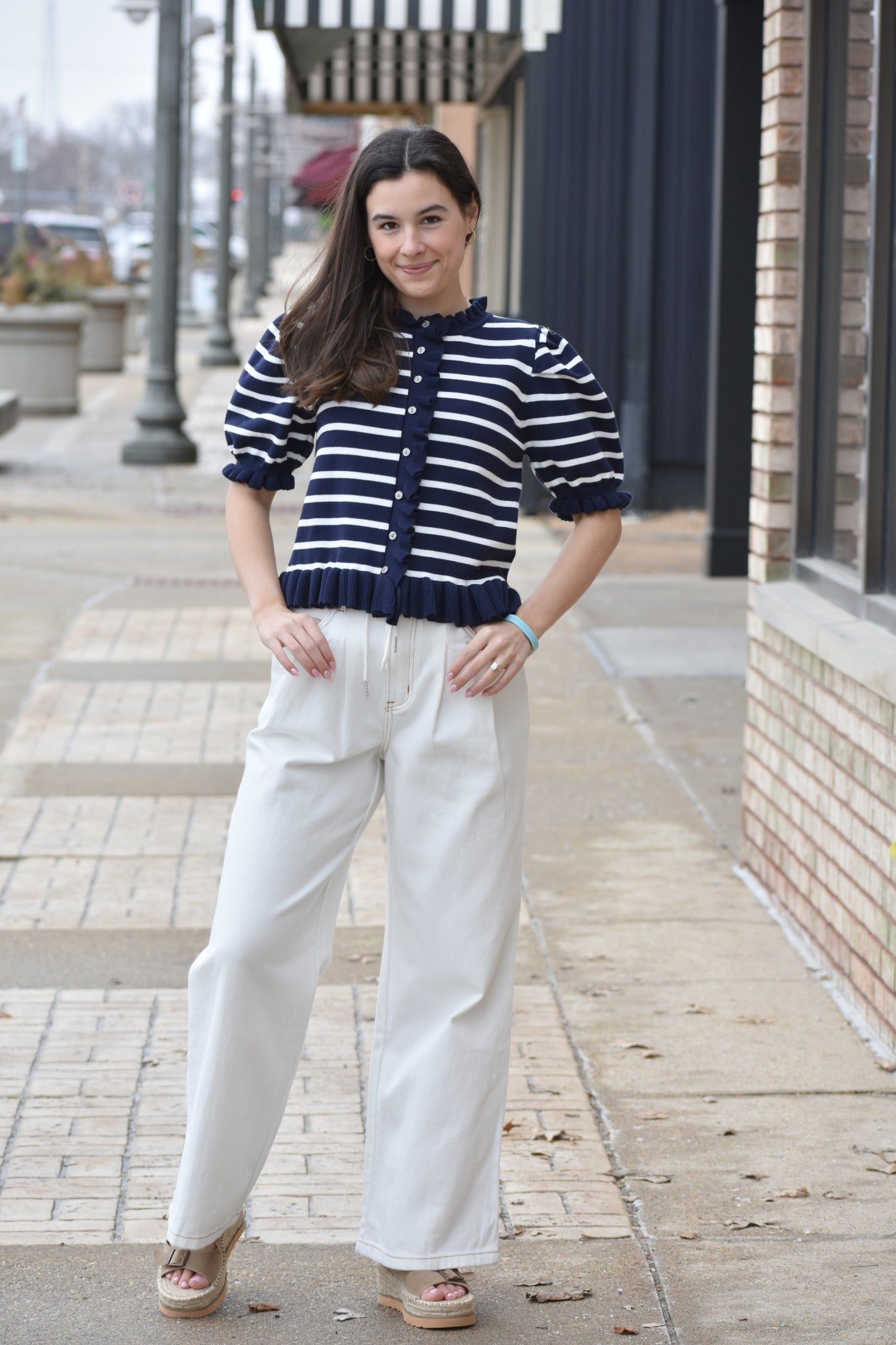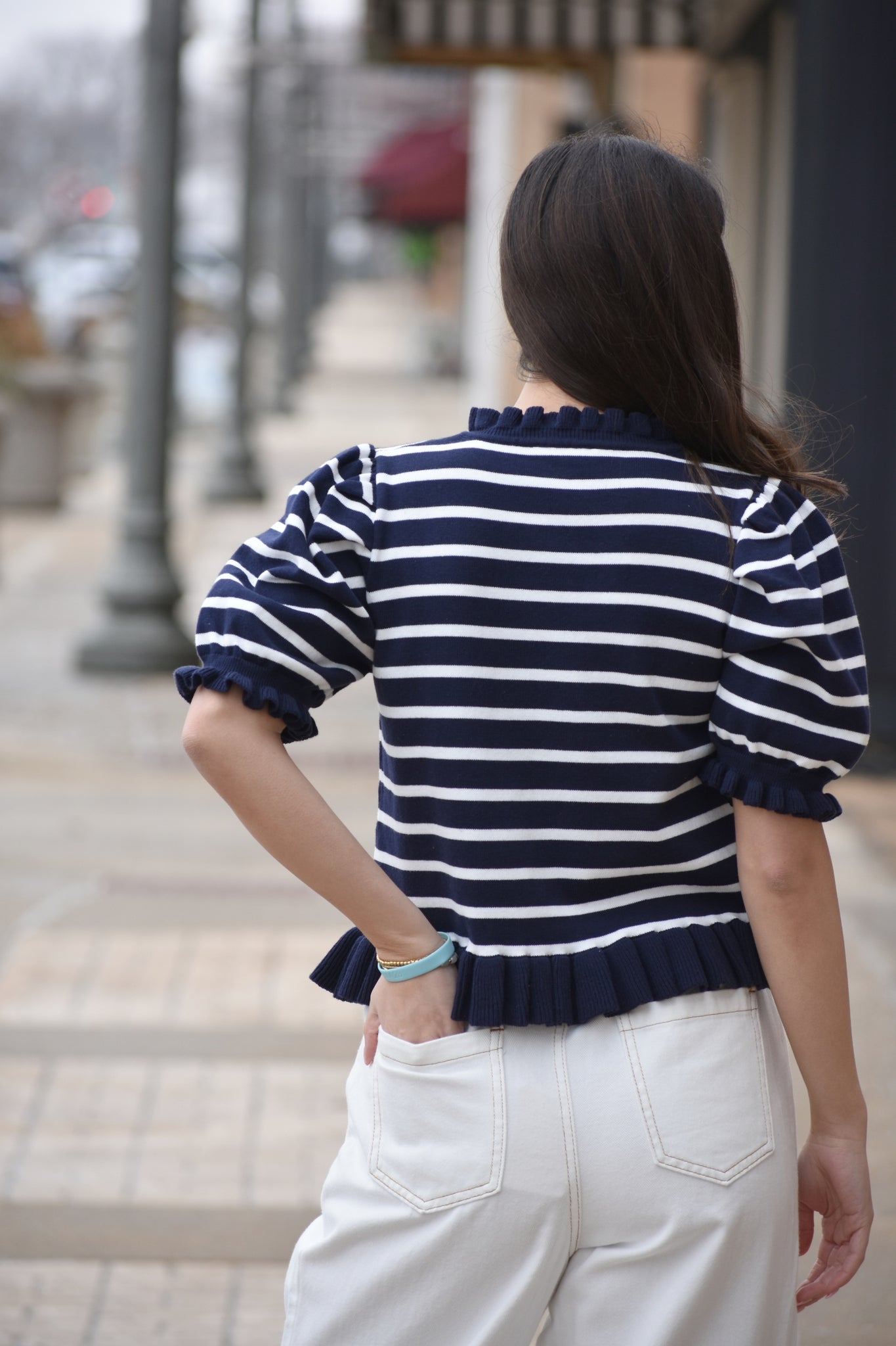 Elevate your wardrobe with the Diana Striped Sweater, featuring classic blue and white stripes that never go out of style. This charming piece showcases delicate puff sleeves and feminine ruffled details at the collar, cuffs, and hem for added texture and movement. The front button closure makes it easy to layer or wear solo. Perfect for creating effortless, polished looks that transition seamlessly from day to evening.