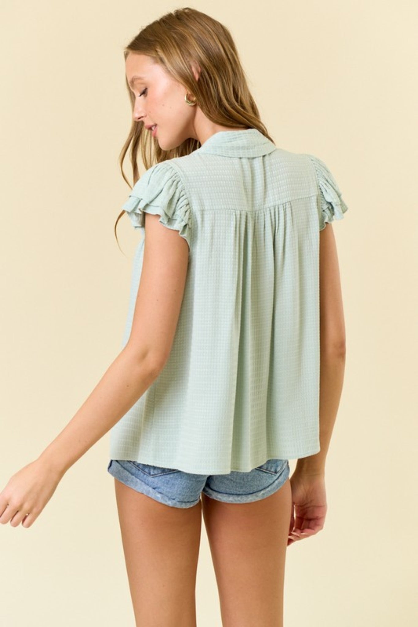 The Hanna Button Down Blouse combines effortless elegance with modern details. Featuring a classic collared neckline and eye-catching double ruffle accents across the shoulders and chest, this piece makes an instant style statement. Cap sleeves and a front button-down closure offer versatile styling options, while the lightweight textured fabric with a subtle grid pattern provides visual interest and comfortable wear. Perfect for layering or wearing solo, this blouse transitions seamlessly from office to weekend occasions.