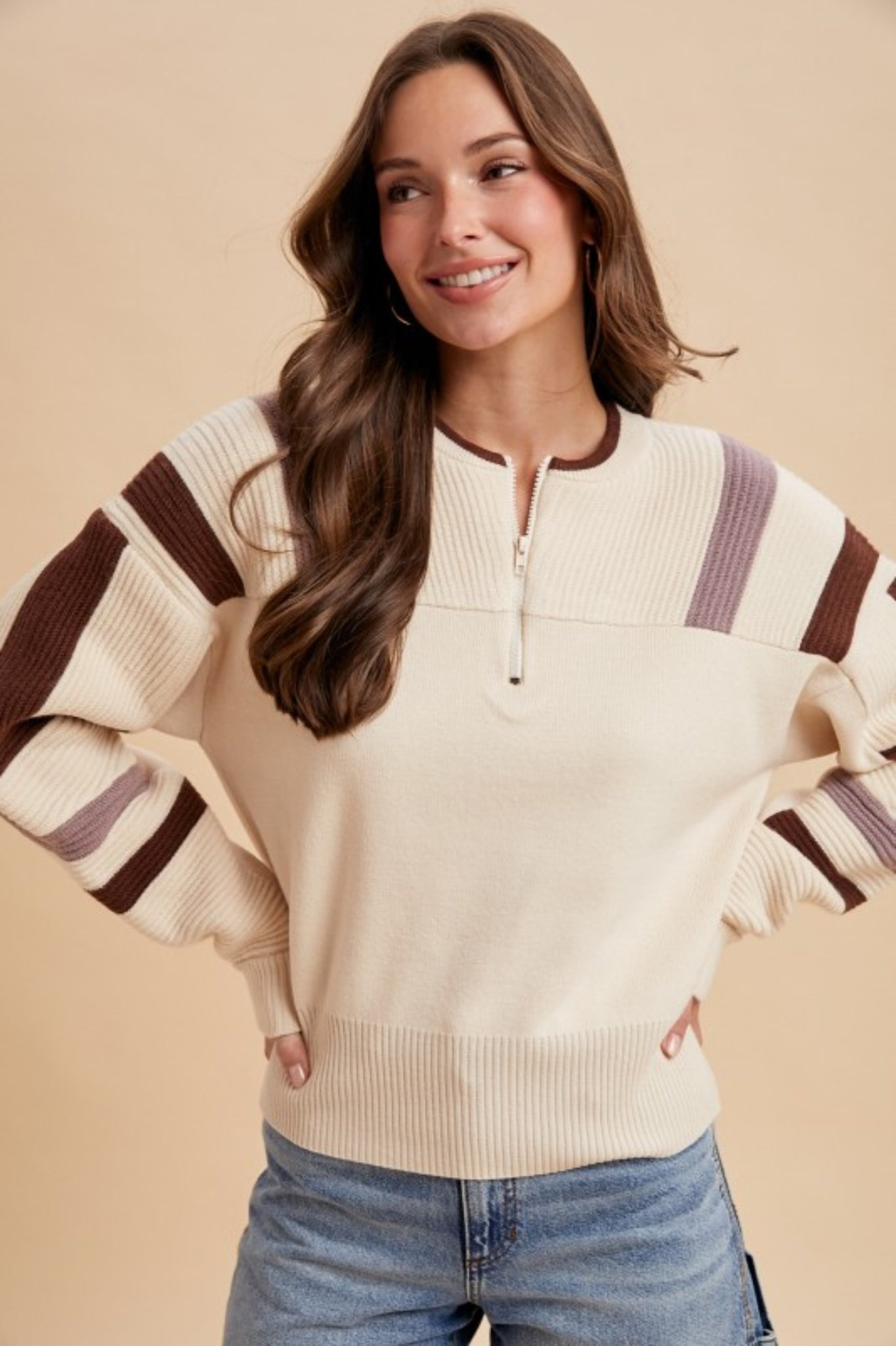 Elevate your casual wardrobe with the Lorelai Half Zip Sweater, a versatile layering essential that effortlessly combines comfort and style. Featuring bold vertical stripes in a rich color palette, this sweater showcases a relaxed drop shoulder silhouette that drapes beautifully for an understated, modern look. The half zip design offers easy on-and-off convenience and adjustable warmth, while the wide ribbed band at the hem keeps everything in place. Perfect for pairing with your favorite jeans or dressing up with tailored trousers, this piece transitions seamlessly from season to season, making it a wardrobe staple you'll reach for again and again.