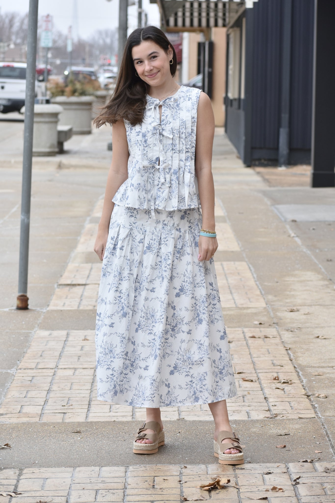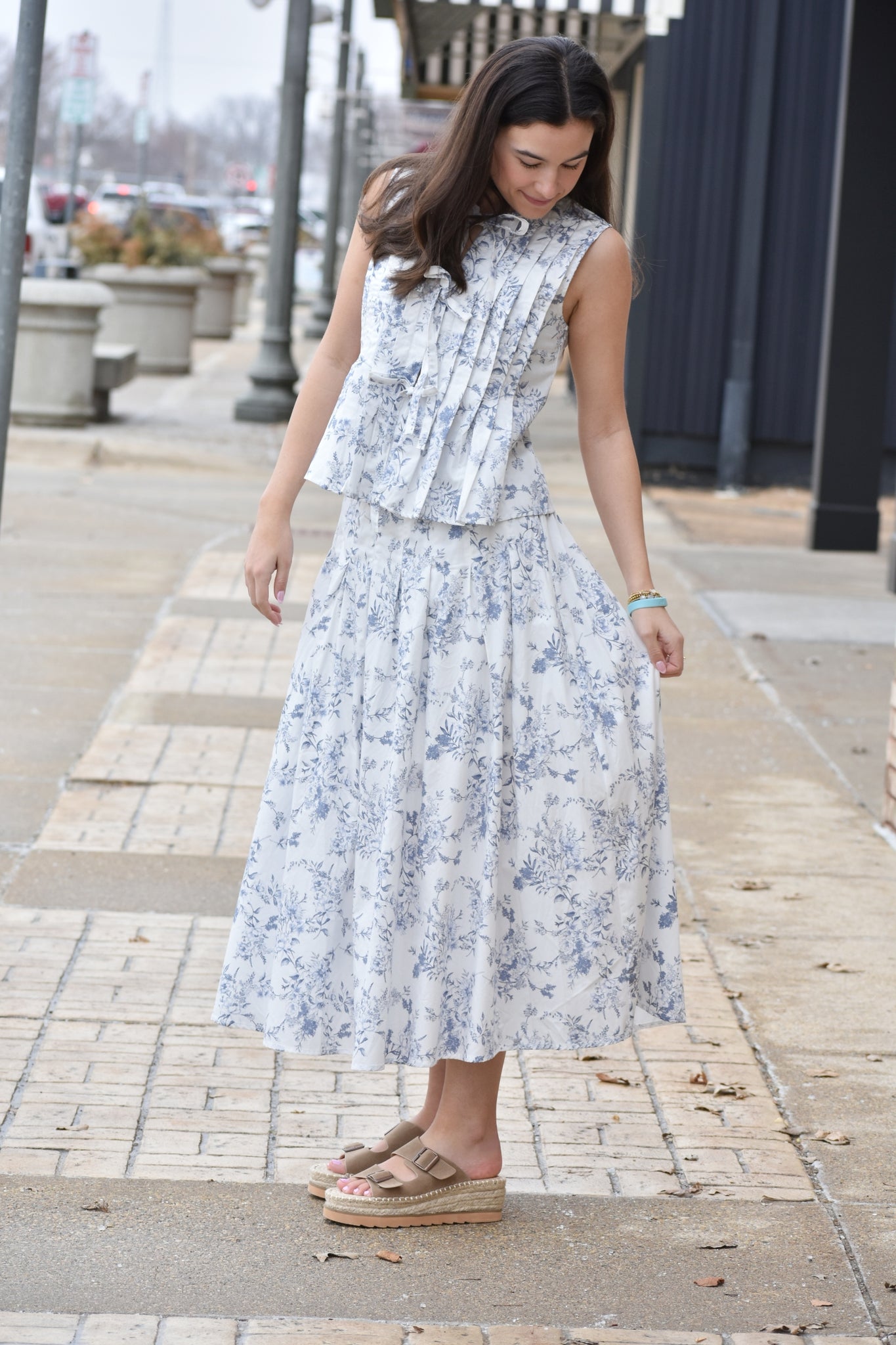 Elevate your wardrobe with the Melissa Floral Pleated Midi Skirt, a timeless piece that combines classic elegance with modern comfort. Featuring a high waist and elastic waistband for a flattering fit, this midi skirt showcases a charming floral toile pattern throughout. The woven fabric provides structure and breathability, while the lined interior ensures smooth wear. Perfect for creating polished looks that transition effortlessly from day to evening, this versatile skirt pairs beautifully with tucked-in blouses, fitted tops, or sweaters for any occasion.