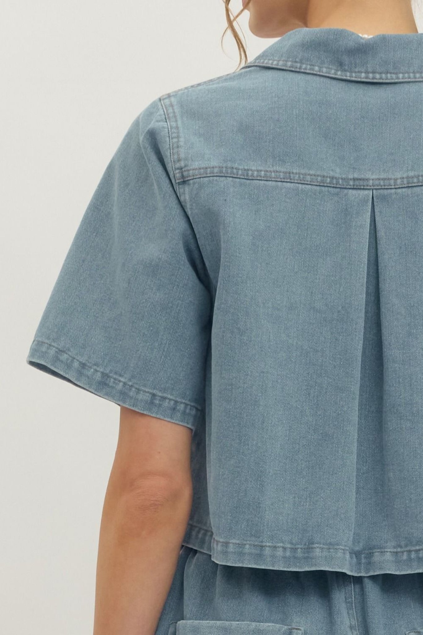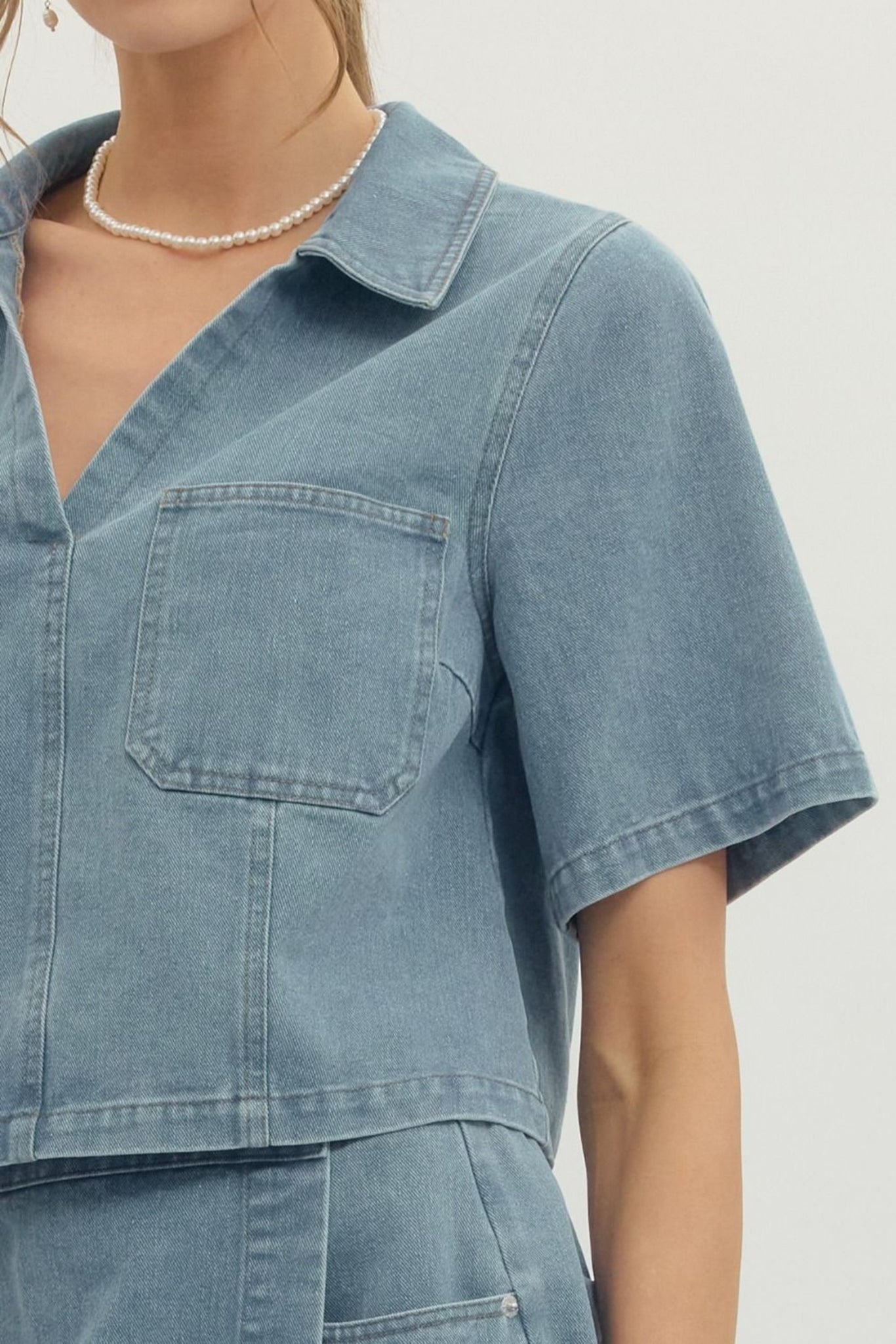 The Valerie Short Sleeve Denim Top combines classic denim styling with modern details. This versatile piece features a spread collar and V-neck design for a flattering silhouette, while functional patch pockets at the front offer practical storage. The back yoke showcases a center pleat detail that adds subtle dimension and movement. Perfect for layering or wearing solo, this woven denim top transitions effortlessly from casual weekends to relaxed workdays.