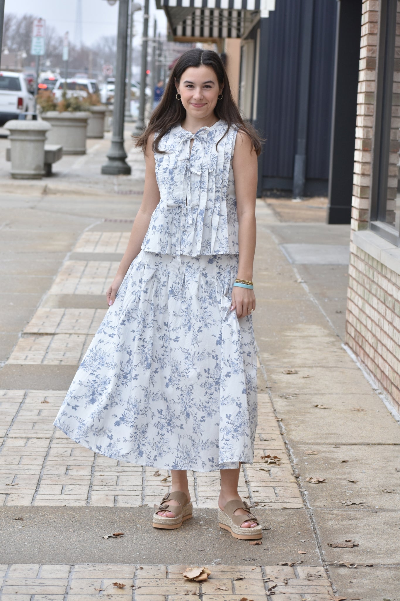 Elevate your wardrobe with this charming sleeveless blouse featuring a classic round neckline and elegant front tie closure. The pleated detail adds dimension and movement, while the delicate floral toile pattern brings timeless sophistication to any outfit. Crafted from quality woven fabric, this unlined piece offers breathable comfort perfect for layering or wearing solo. An effortless addition to your everyday style.