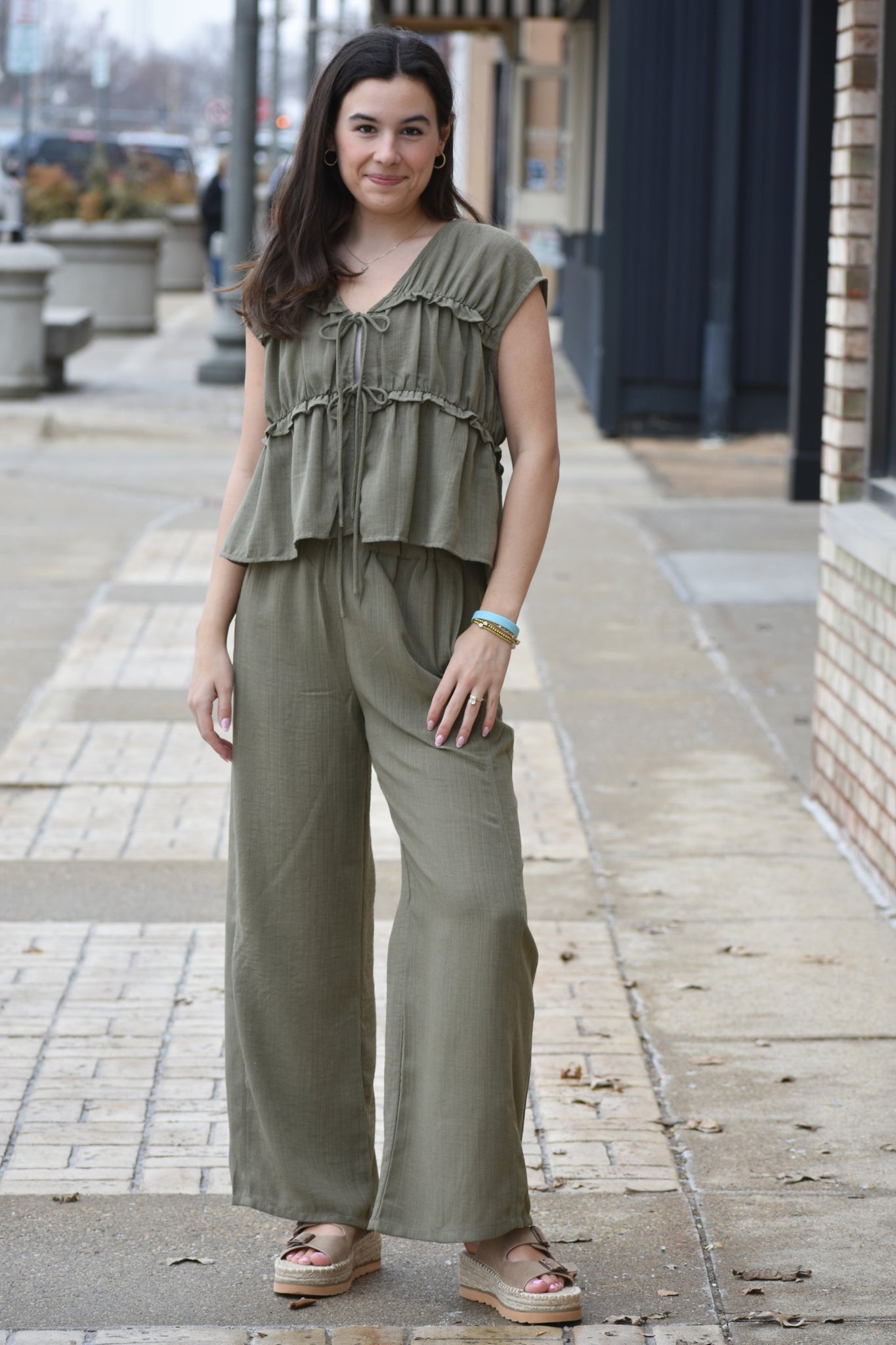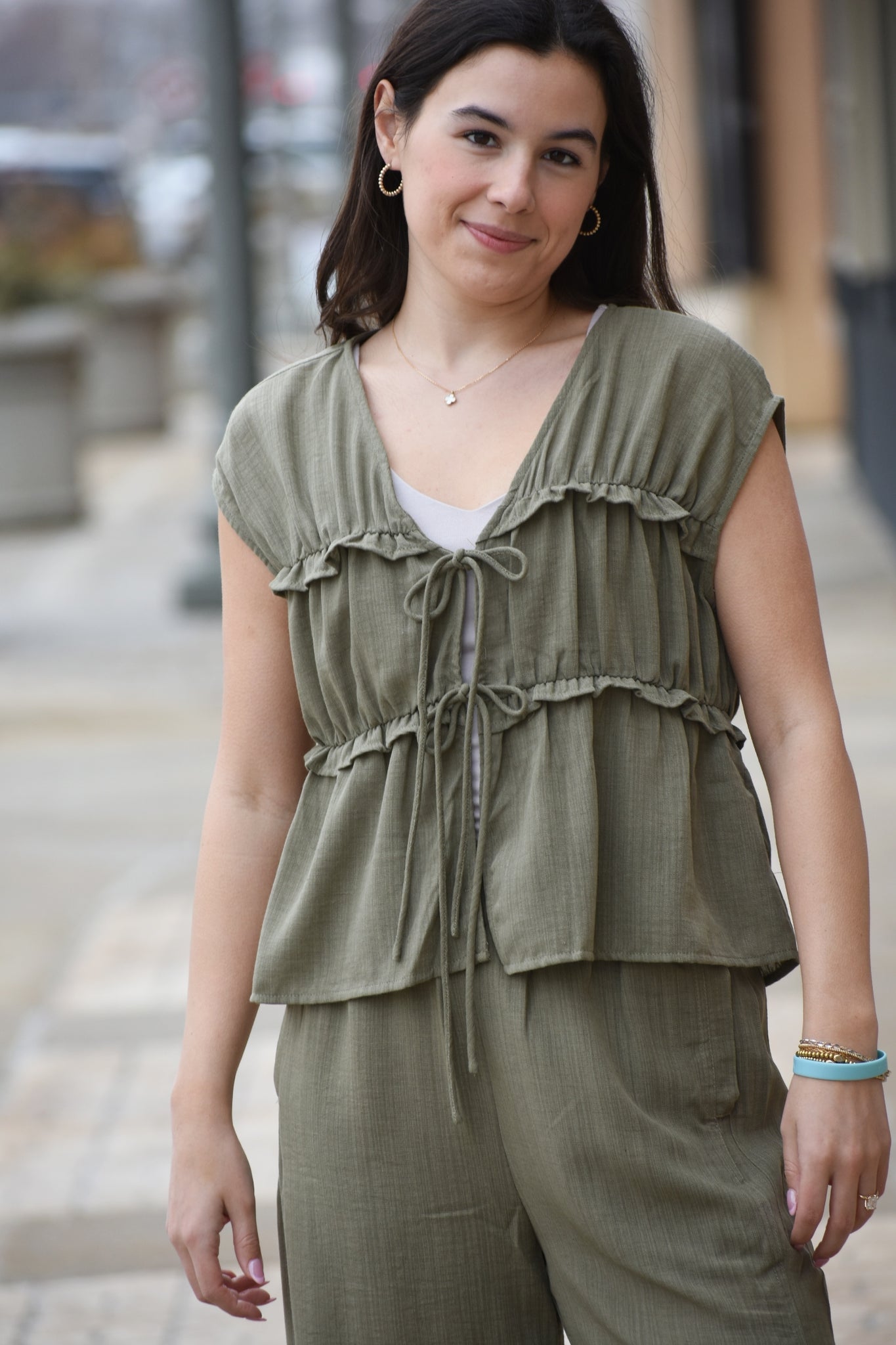 Effortless elegance meets everyday comfort in this Clara Sleeveless Top. The lightweight fabric drapes beautifully while the front tie ruffle detail adds a playful touch to the classic v-neck silhouette. Perfect for layering or wearing solo, this versatile piece transitions seamlessly from casual outings to relaxed social gatherings. The sleeveless design keeps you cool and comfortable, making it an ideal choice for warmer seasons or as a layering essential year-round.