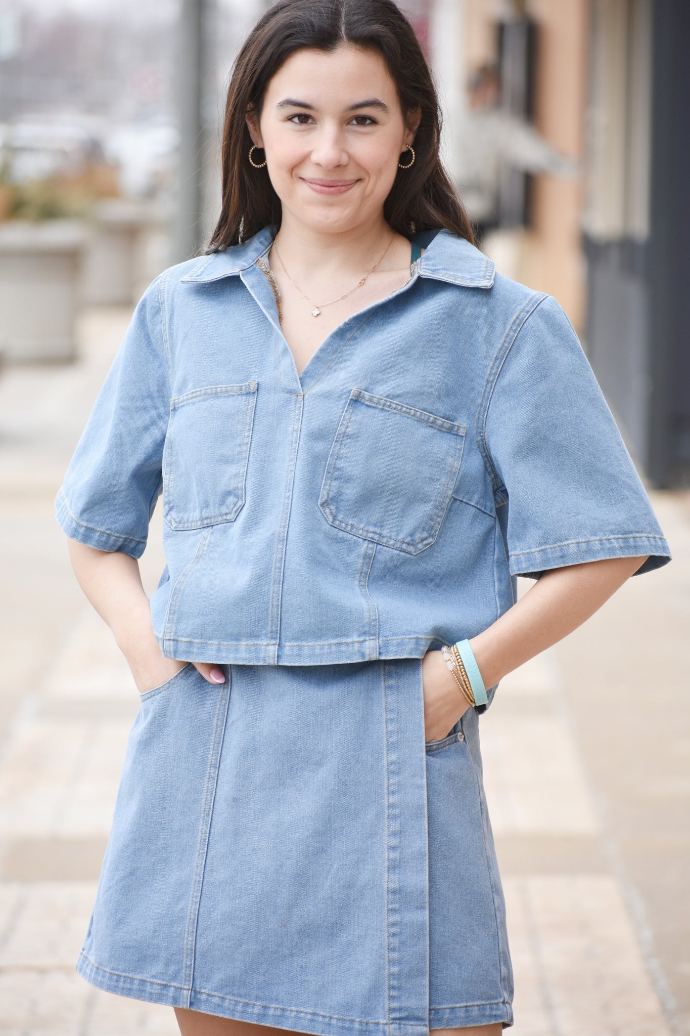 The Valerie Short Sleeve Denim Top combines classic denim styling with modern details. This versatile piece features a spread collar and V-neck design for a flattering silhouette, while functional patch pockets at the front offer practical storage. The back yoke showcases a center pleat detail that adds subtle dimension and movement. Perfect for layering or wearing solo, this woven denim top transitions effortlessly from casual weekends to relaxed workdays.